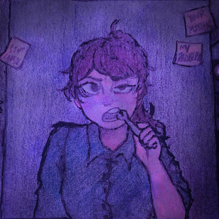 The sad girl who witnessed multiple deaths throughout her life, starting when she was three years old when her mother died giving birth to her brother. After such a traumatic experience, Mary began to talk to her Origami Cat (Naomi) whenever she felt lonely or missed her mother. Then at six years old, Mary was the witness of a double murder, where two mascot actors from a theater she’s grown to love were killed by the hands of another actor. She began to have nightmares constantly, and it wasn’t helped that a year later, her little brother was attacked by the wire puppet of the Rat.While in therapy, Mary began to confront her past in order to stop her nightmares. It was a tough order for a child so young to take on, but Mary was able to manage… because she had the Origami Cat and her father’s music, after all. After remembering the cause for her nightmares, Mary tells her therapist about the incident she witnessed on October 13th, 1961. This information gets into the hands of the police, who arrest the true killer; Vincent Allard, the Puppeteer.Mary gives her witness testimony in court, all while Vincent stares her down. Mary begins to grow paranoid, and her nightmares return again as she begins to fear the man himself. It doesn’t help that she begins talking to “Vinnie” (Danny), who blames her for everything that happened.Into her adulthood, Mary lives an isolated life due to her fragmented identity and institutional distrust of others. She’s distant with her younger brother, as she still hasn’t overcome her guilt over what happened to him.Eventually, she runs into Chancy, whom she remembers from the theater. Thanks to him (and an encounter at Freddy Fazbear’s Pizza), Mary begins to investigate her past and uncovered her foggy memories. Unfortunately, “Vinnie” is angry at her for this, and begins to taunt her again. She tries to ignore him, but eventually she slips up and makes another “mistake.” Falling asleep on the job, Mary fails to notice two children sneaking into the Rowboatics factory she was hired to watch, resulting in their deaths. It doesn’t help that only two months later, Mary witnesses the Bite of 87 during another investigation, having spoken to the victim enough in the past to consider him a good guy. Impulsively and sick of the weight of her guilt, Mary decides to end this by becoming a night guard at Candy’s Burgers and Fries, to confront her past head-on.